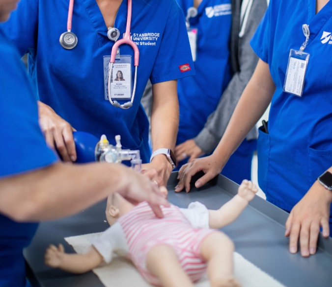 Hands-on pediatric simulation training at Stanbridge University demonstrates the advanced clinical responsibilities highlighted in the MA vs LVN comparison.